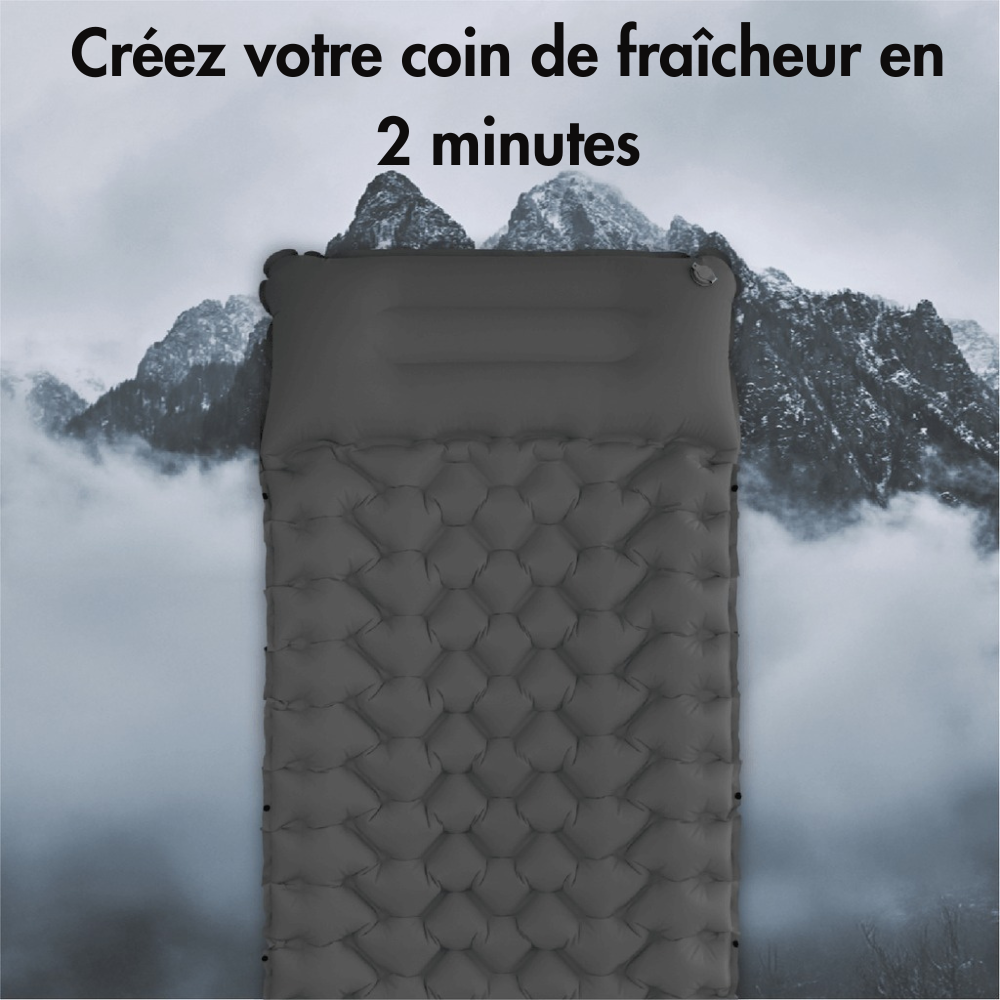 🌀 1 matelas, 4 saisons 💨 Gonflage express, sans prise de tête. 🛏️ Confort nomade. 🎒 Se plie, se porte, s’oublie.